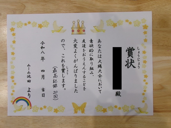 大縄大会頑張りました! おわりの会で一人ずつ賞状を渡しました。